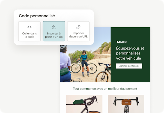 - Concevez et téléchargez votre e-mail créé dans Canva au format HTML, puis importez-le dans Mailchimp. Prévisualisez et testez votre e-mail pour vous assurer qu’il s’affiche correctement partout. Disponible pour les clients des plans Gratuit et Essentiels jusqu’au 31 décembre.